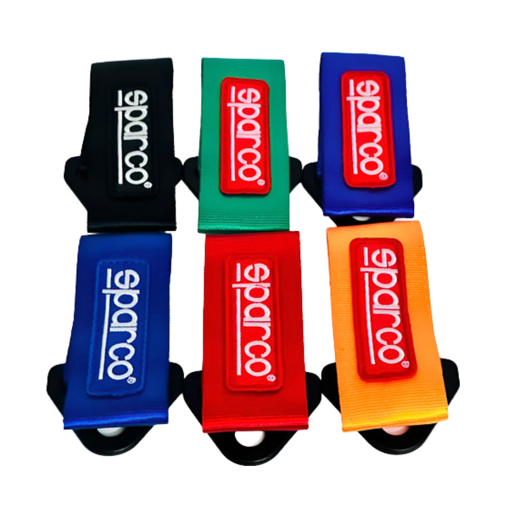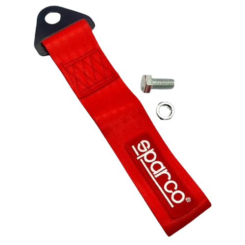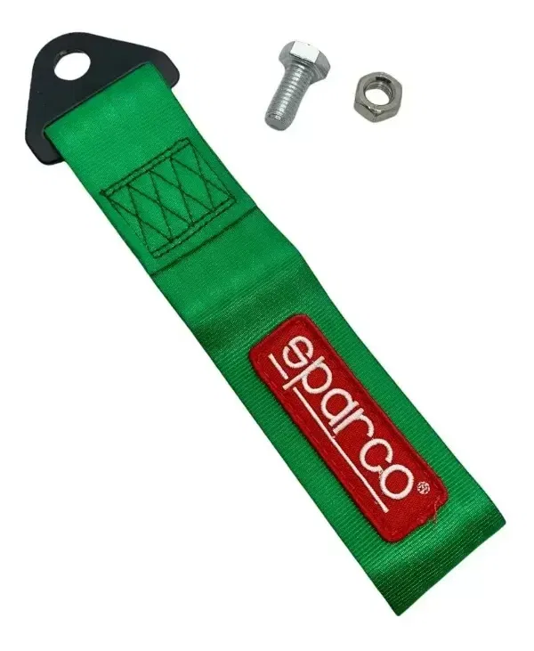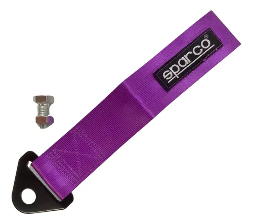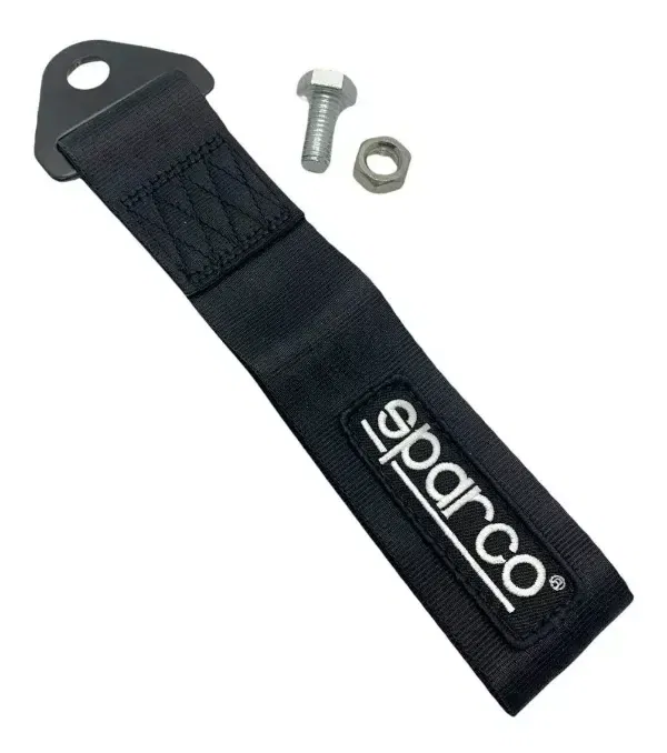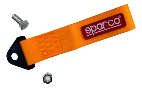Cinta de remolque Sparco universal. Colocación mediante bulon y tuerca que se adapta al perno de anclaje. Si la parrilla cuenta con espacio es posible sujetarla sin inconvenientes.