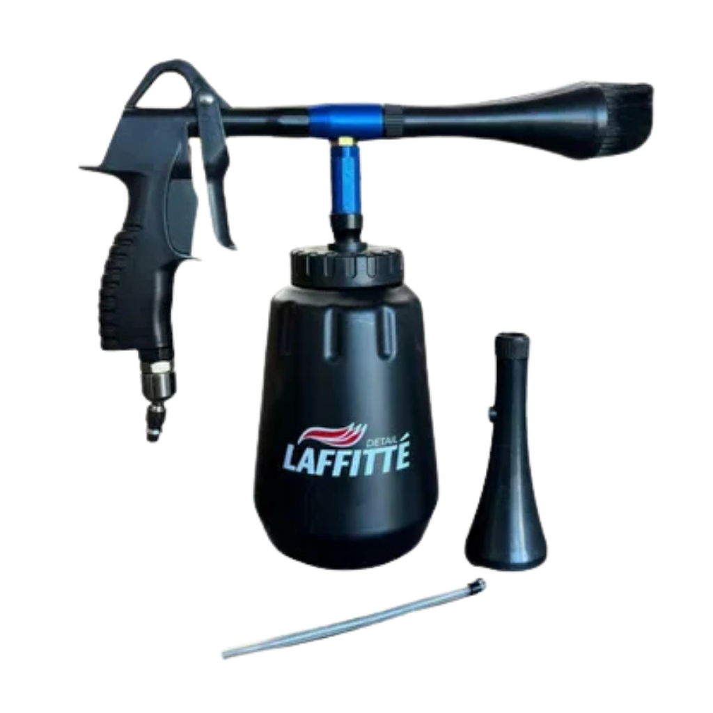Trabaja con un compresor de aire que le da la potencia para que el limpiador contenido en el recipiente de la pistola (desengrasante / shampoo) alcance las grietas en las cuales no se pueden alcanzar con la mano.